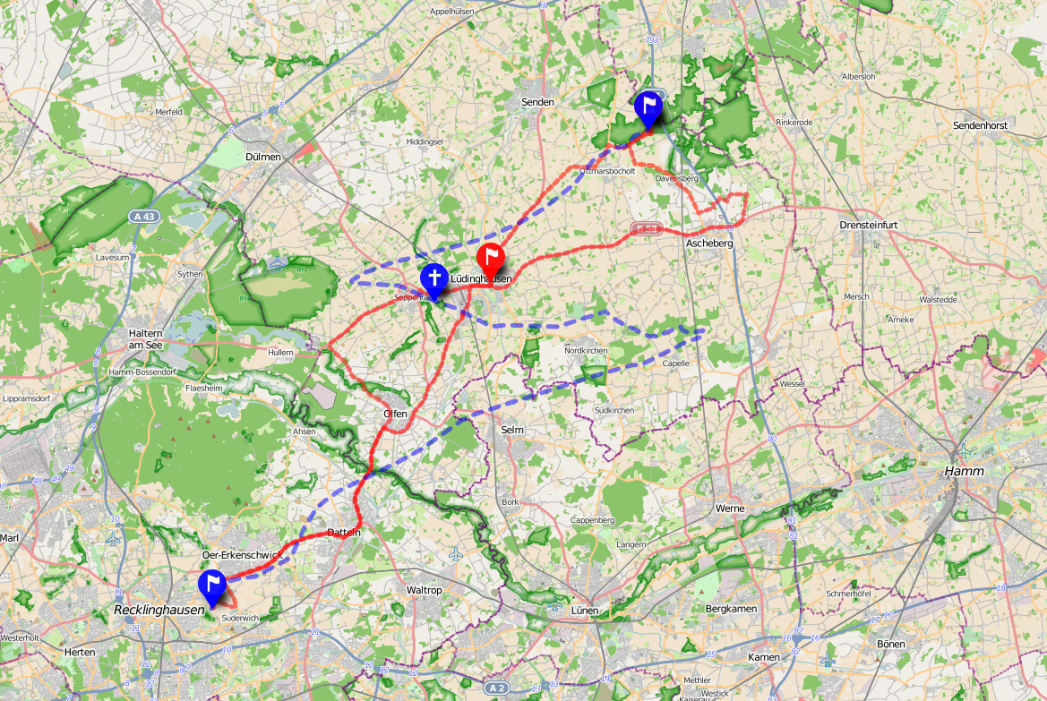 Link zur Karte. In blau ist die Flugroute des Ballons dargestellt. Die rote Linie ist der Track der Verfolger.