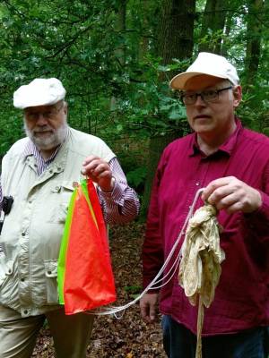 • 29.05.2016 11:39: Die ersten Teile der alten Ballonhülle konnten geborgen werden. Außerdem konnten wir ein Wurfsäckchen aus dem Baum retten, das wir vor drei Tagen hinauf geschossen hatten.