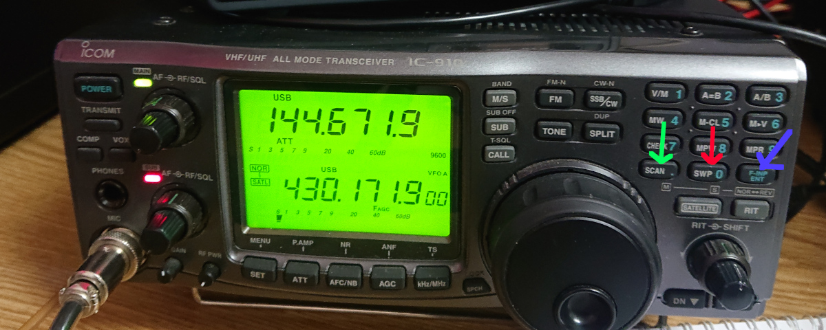 Der IC-910H ist im SAT-Mode direkt für Verbindungen über QO-100 nutzbar. Im SAT-Mode werden beide VFOs gleichzeitig verändert, wenn eine Frequenz eingestellt wird. Der Downlink wird von 10,4 GHz auf 144 MHz umgesetzt. Der Sender wird von 430 MHz auf 2,4GHz zum Uplink umgesetzt. Eine Empfangsfrequenz von 10.489,680 MHz wird auf 144,680 MHz konvertiert. Die Sendefrequenz von 430,180 Mhz wird im UpConverter auf 2.400,180 MHz umgesetzt und ist über den Transponder wiederrum auf 10.489,680 MHz zu hören. Der Versatz zwischen Empfänger und Sender am Transponder beträngt also 8.089,5 MHz. In der Regel werden für DX Spots und Skeds die 10 GHz Downlinkfrequenzen angegeben.