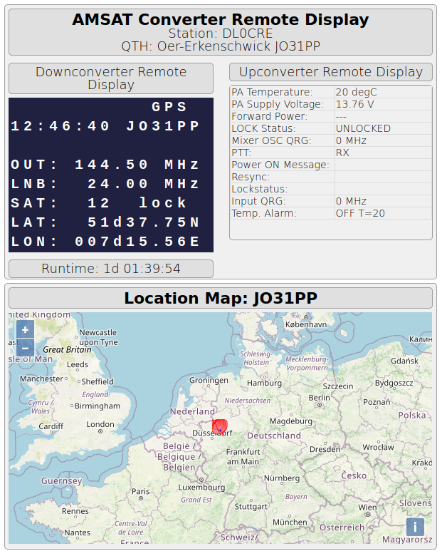 Sowohl Up- als auch Downconverter geben per serieller Schnittstelle Telemetriedaten aus. Diese werden mittels eines Raspberry Pis und einem Webserver im LAN der Clubstation zur Verfügung gestellt. Das AMSAT-DL Programm liefert einige Ist-Daten. Diese sind unter http://outdoorunit.lindenstrasse.netz/amsatdisplay.html von allen Rechnern im LAN erreichbar.