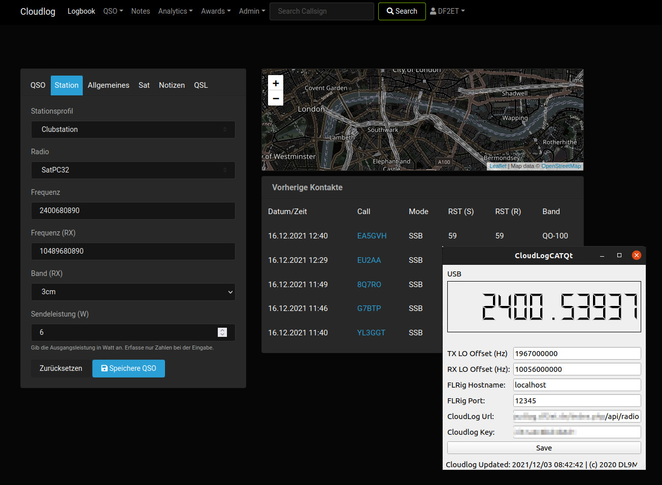 Das Stationslogbuch von DL0CRE wird in einer Cloudlog Instanz geführt. Diese ist unter https://log.n18.de erreichbar. Dort können die SAT QSOs direkt und live geloggt werden. Für die automatische Übertragung von Sende- und Empfangsfrequenz ist auf dem UKW-Shack PC ein Programm namens CloudLogCatQt installiert. Dieses liest die Frequenz aus dem TRX mittels flrig aus und überträgt sie via API ins Cloudlog.