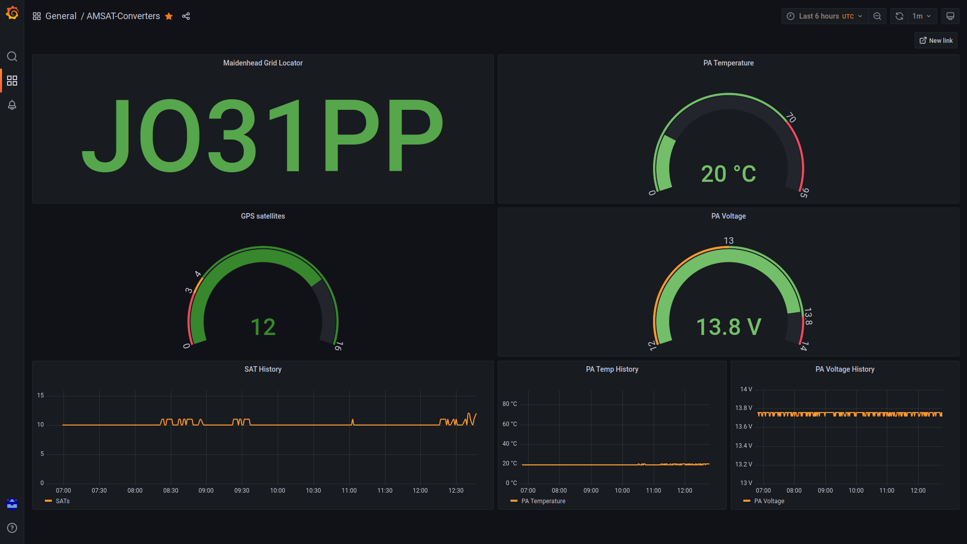 Sämtliche Daten werden mittels SQL-Datenbank auch für ein Grafana Dashboard gesammelt und aufbereitet. Somit sind auch die historischen Werte einsehbar und visualisiert dargestellt. Das Grafana Dashboard ist im N18-LAN unter http://outdoorunit.lindenstrasse.netz:3000/d/gfW33dhnk/amsat-converters?orgId=1&refresh=1m einsehbar.