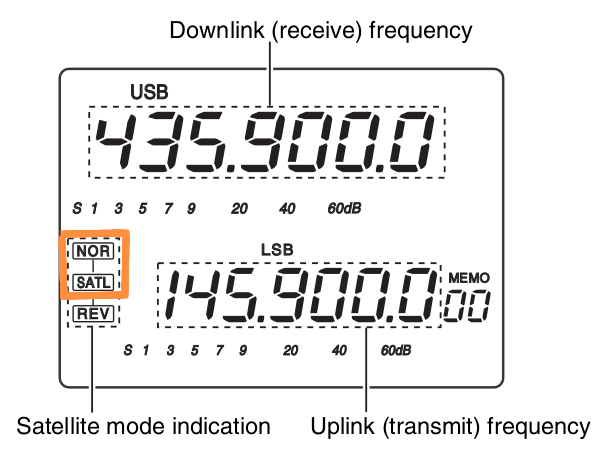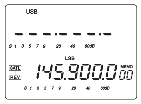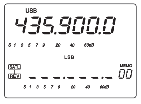 (roter Pfeil) gedrückt werden. Das S im Quadrat steht für den Sub-VFO im SAT-Mode. Der Main-VFO (oben) wird ausgeblendet und die TX-Frequenz kann unabhängig eingstellt werden: