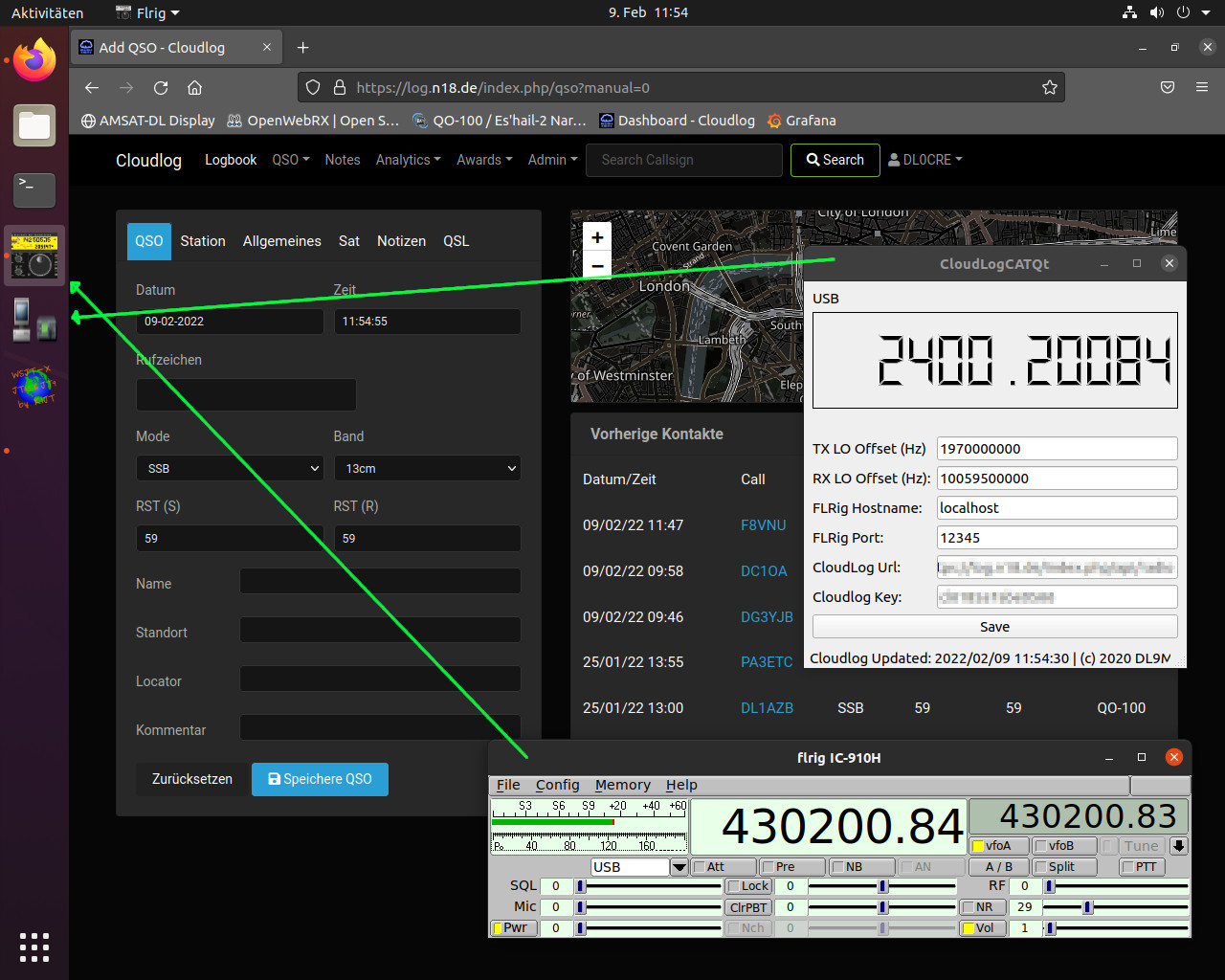 Damit das funktioniert, muss zunächst flrig gestartet werden. Der Knopf dafür findet sich im Ubuntu unter den Favoriten in der linken Leiste. Sobald das initialisiert ist, kann auch CloudLogCatQt gestartet werden. Beide Progamme können dann einfach im Hintergrund laufen. CloudLogCatQt überträgt die Frequenz jeweils nur bei Änderungen. Damit das beim ersten mal klappt muss ggf. einmal kurz am VFO-Knopf hin und her gedreht werden. Dann sollten die Frequenzen im Tab „Station“ eingetragen sein. Zum Loggen kann man die Funktion „Live“ unter „QSO“ verwenden. Auch der SAT Modus sowie QO-100 als Satellitenname werden automatisch gesetzt.