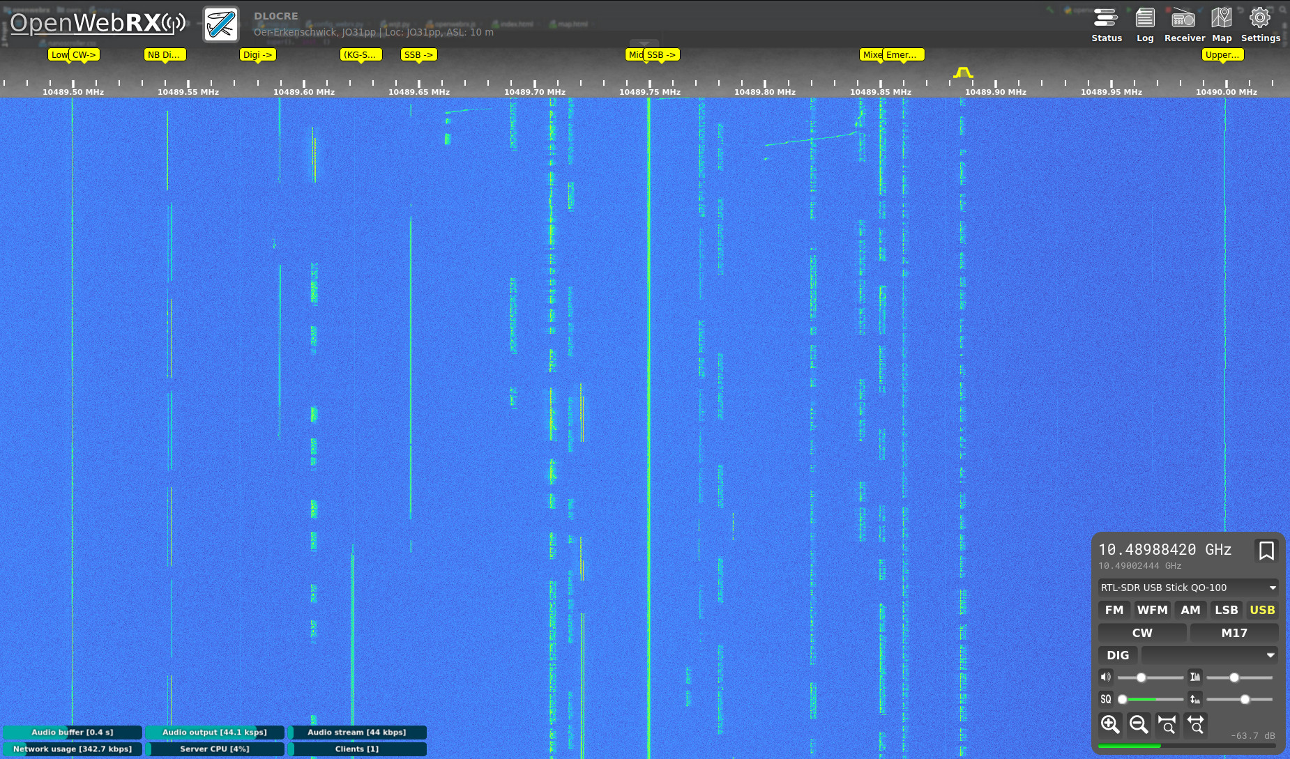 Für die Beobachtung des Spektrums auf dem Transponder sowie als Kontrollempfänger kann ein/das SDR dienen. Bei DL0CRE ist eine Leitung des Quattro LNB auf ein RTL SDR Stick geschaltet. Damit kann auf einen Blick die Aktivität auf dem Transponder beobachtet werden. Außerdem lassen sich verschiedene (auch digitale) Modulationsarten direkt decodieren. Das SDR ist intern unter http://box.lindenstrasse.netz:8073 zu erreichen. Von extern ist es unter https://websdr.n18.de erreichbar.